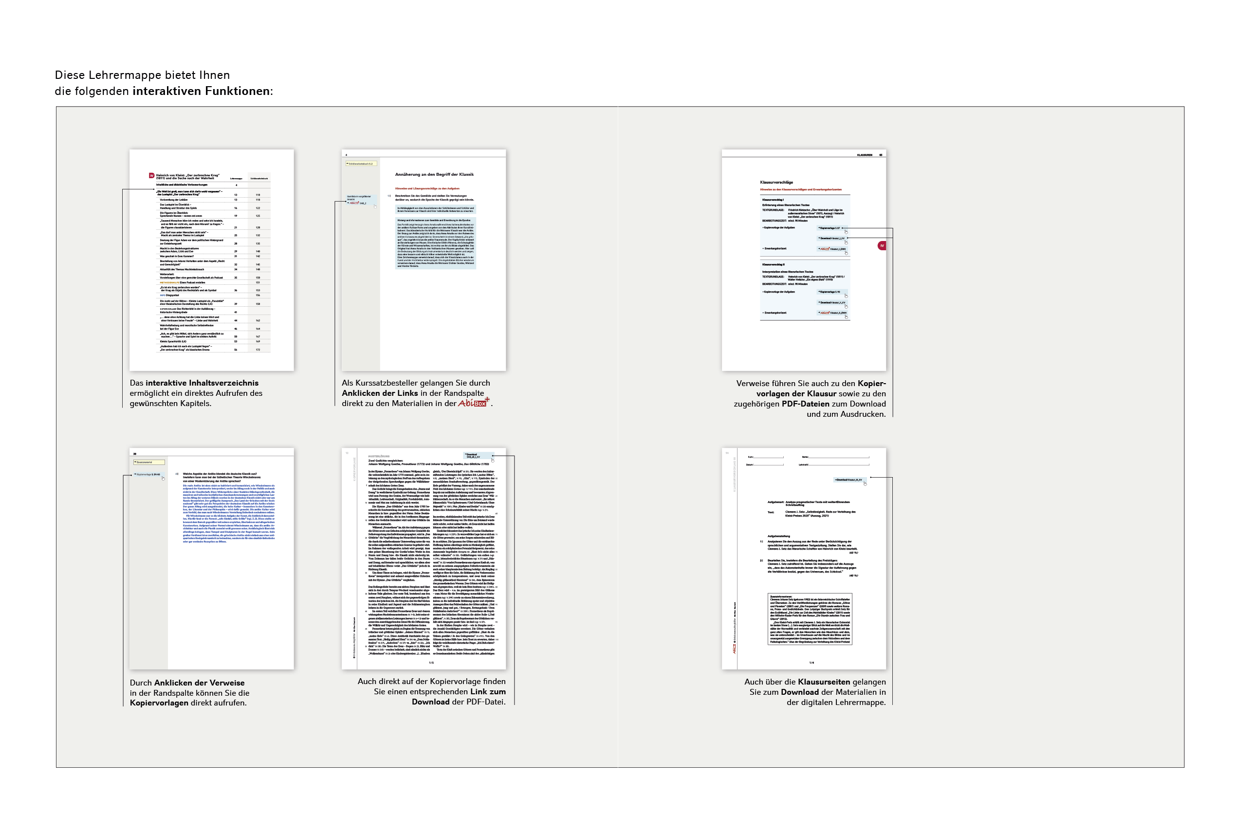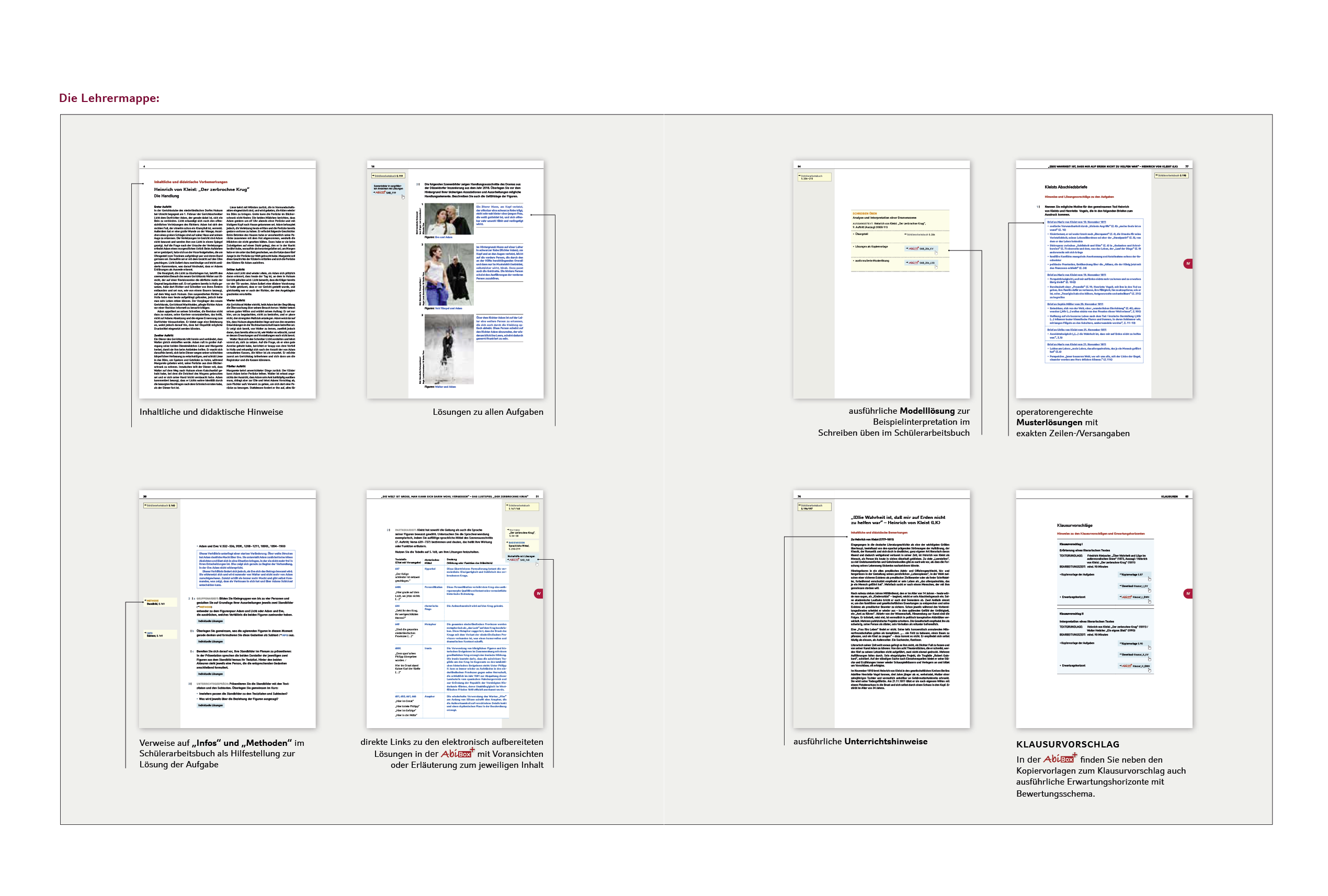 - die Kopiervorlagen, Lösungen und Bewertungsbögen sämtlicher Klausuren zur Abi-Box.