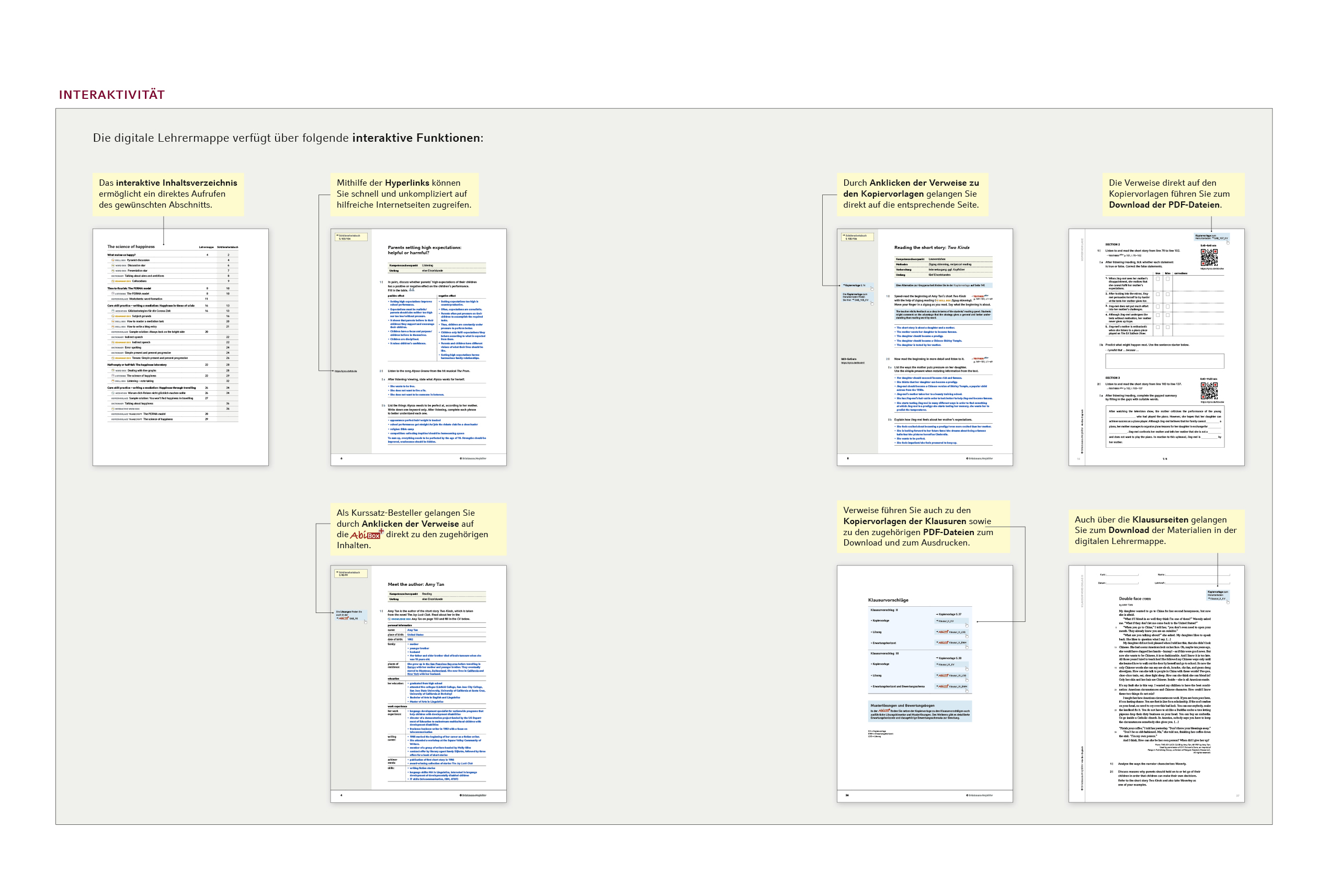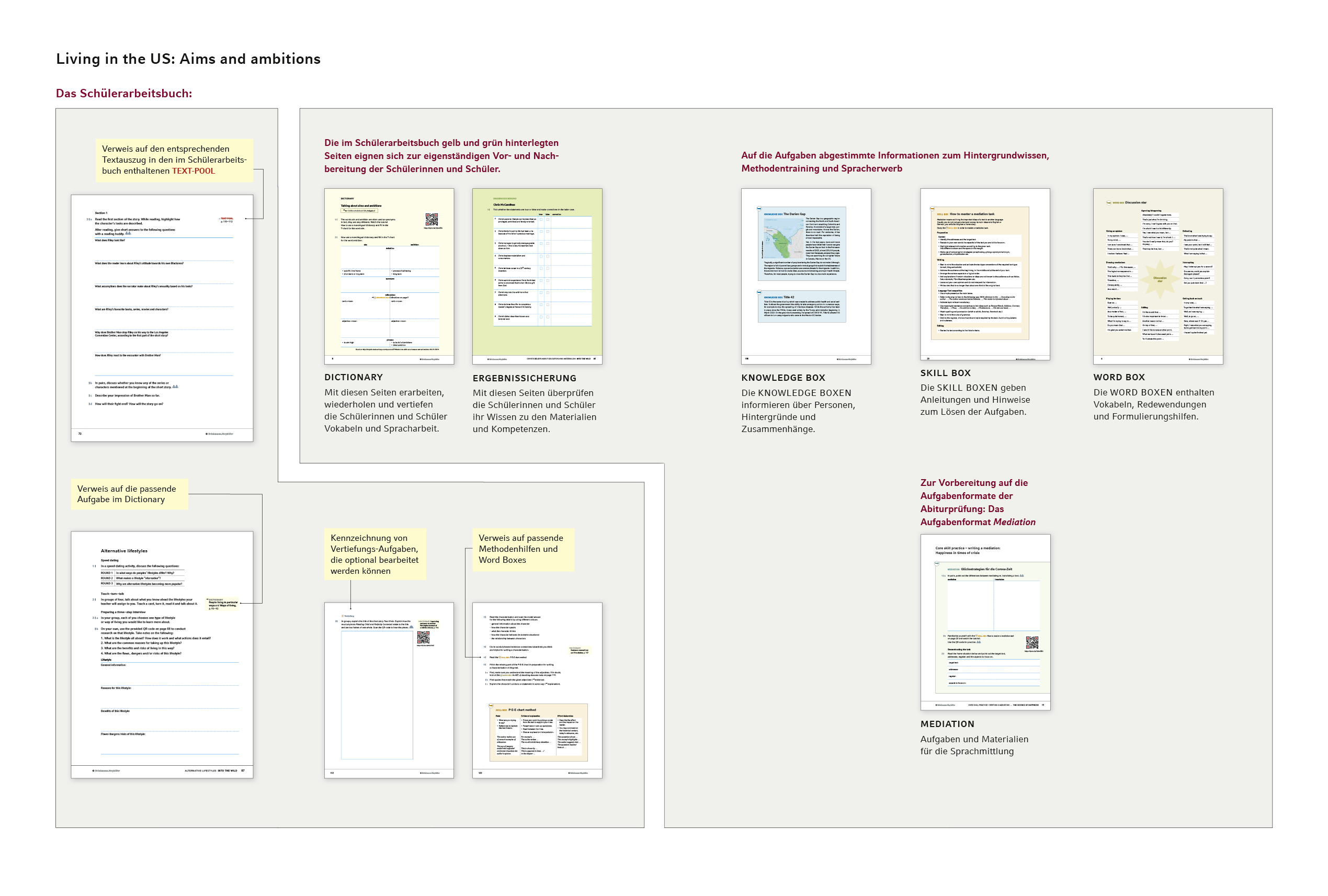 Das integrierte Dictionary mit abwechslungsreichen Übungen zu Wortschatz und Grammatik sowie die Einbettung digitaler Übungen und Tutorials fördern darüber hinaus den Aufbau einer differenzierten Ausdrucksfähigkeit in der Zielsprache. Aktivierende Unterrichtsformen, kooperative Lernarrangements sowie die Transparenz der Ergebnissicherung fördern die Fähigkeiten der Schüler/-innen zum selbstständigen Arbeiten.