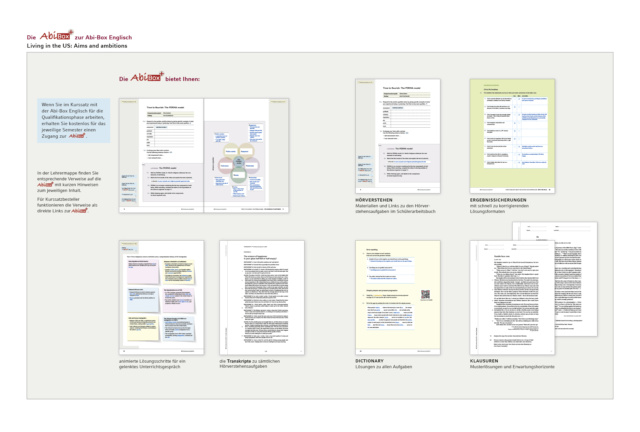 In der Abi-Box+ Logo finden Lehrkräfte die Lösungen zu sämtlichen Exam Practices, Ergebnissicherungen und Dictionary-Übungen sowie darüber hinaus verschiedene Projektarbeiten, die flexibel in den Unterrichtsverlauf integriert werden können und die schülerorientiert die Halbjahresthemen vertiefen.
