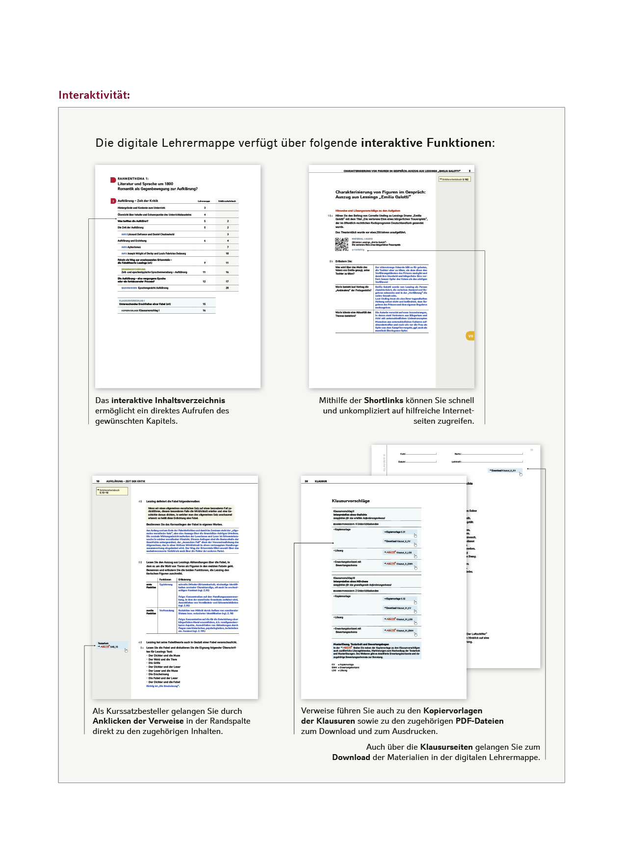 - die Kopiervorlagen, Lösungen und Bewertungsbögen sämtlicher Klausuren zur Abi-Box sowie