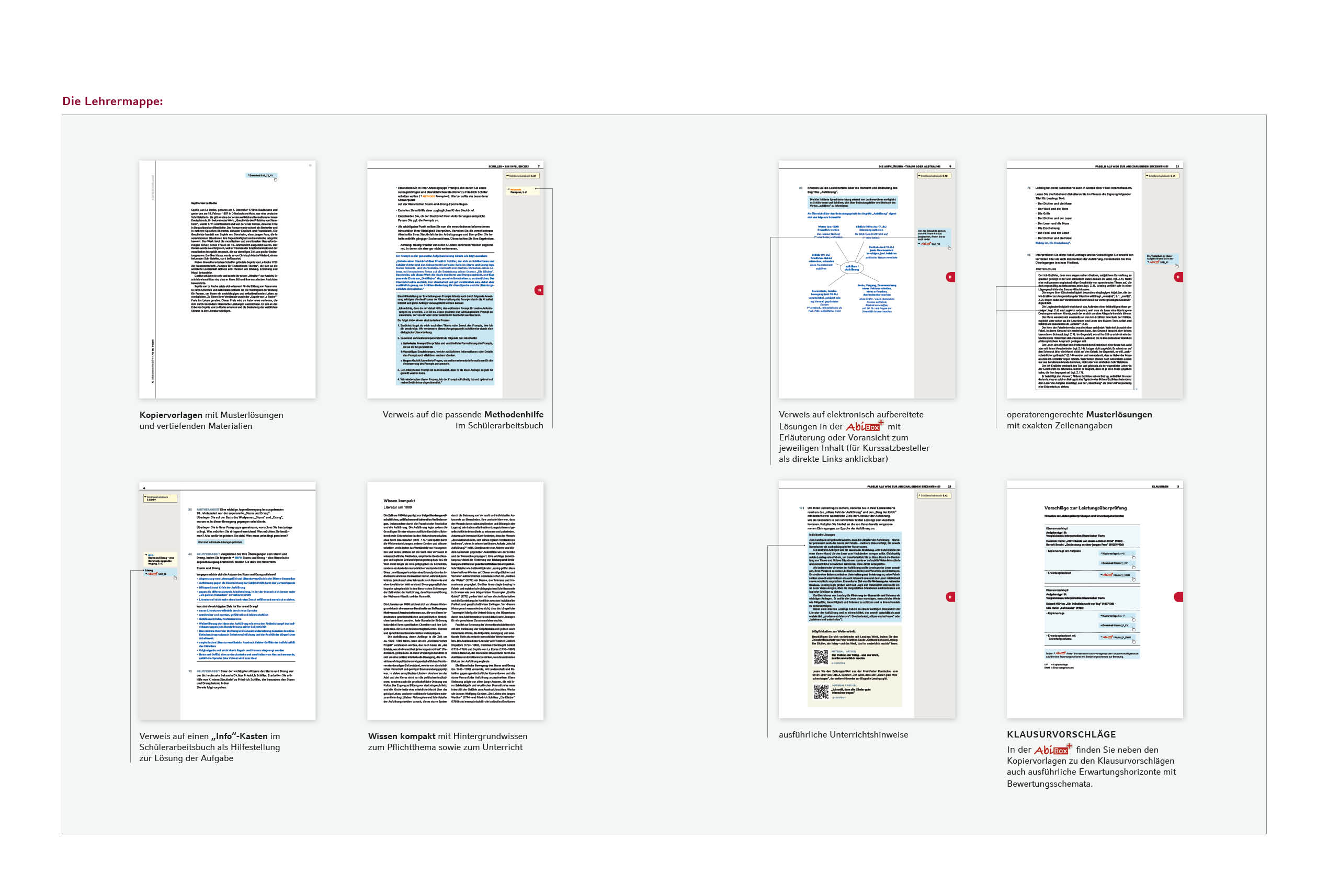 - die Kopiervorlagen, Lösungen und Bewertungsbögen sämtlicher Klausuren zur Abi-Box.